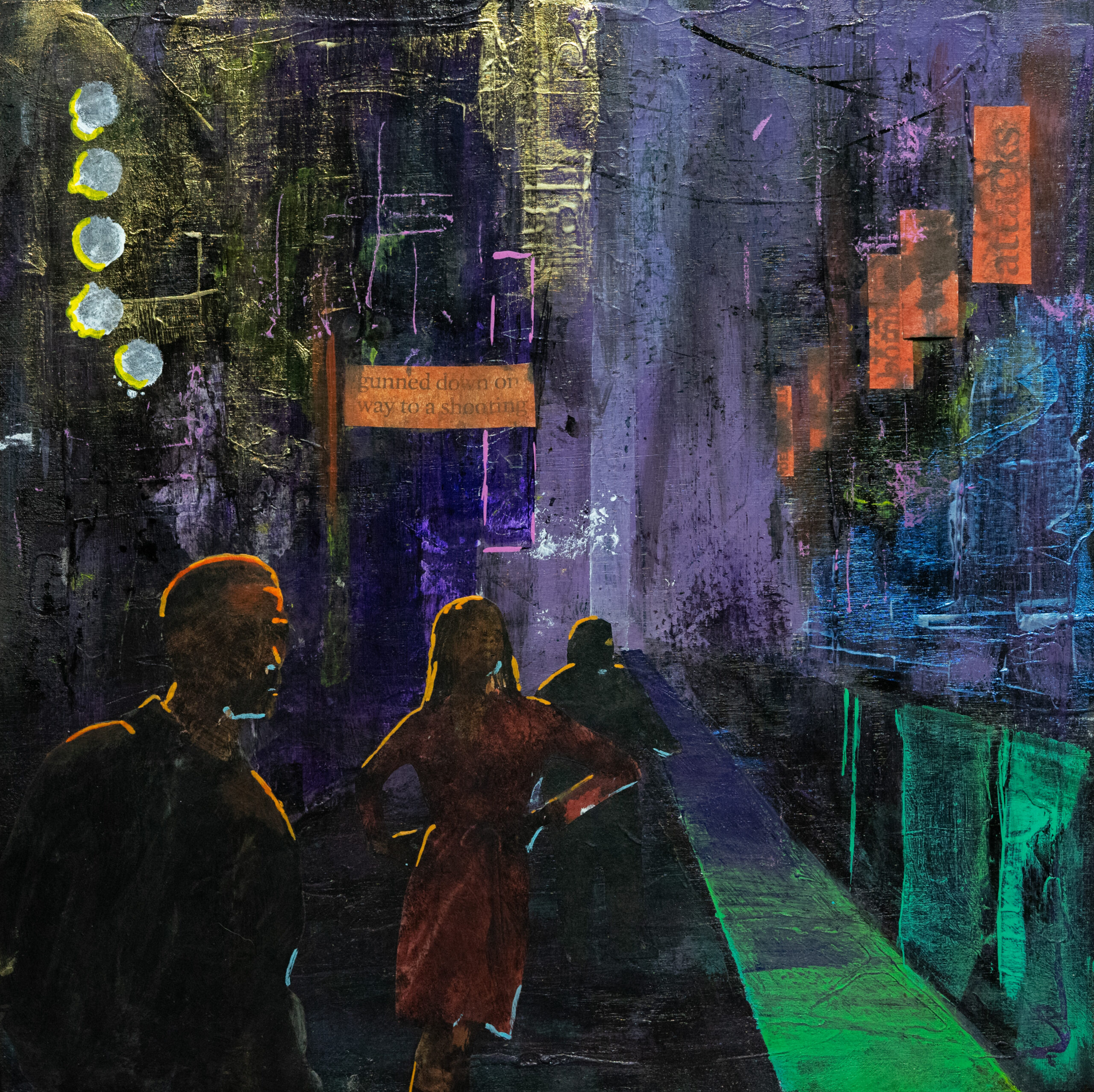 Acrylic and india ink, paper transfers, cut paper, cardboard, pumice. On canvas.